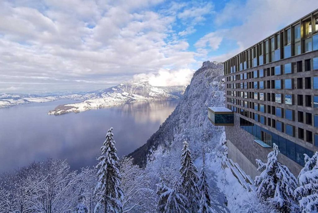 Luxus pur auf über 1.800 m²: Hier findest du alles von Infinity-Pools über Saunalandschaften bis hin zu Beautybehandlungen – mit Blick auf den verschneiten Vierwaldstättersee.